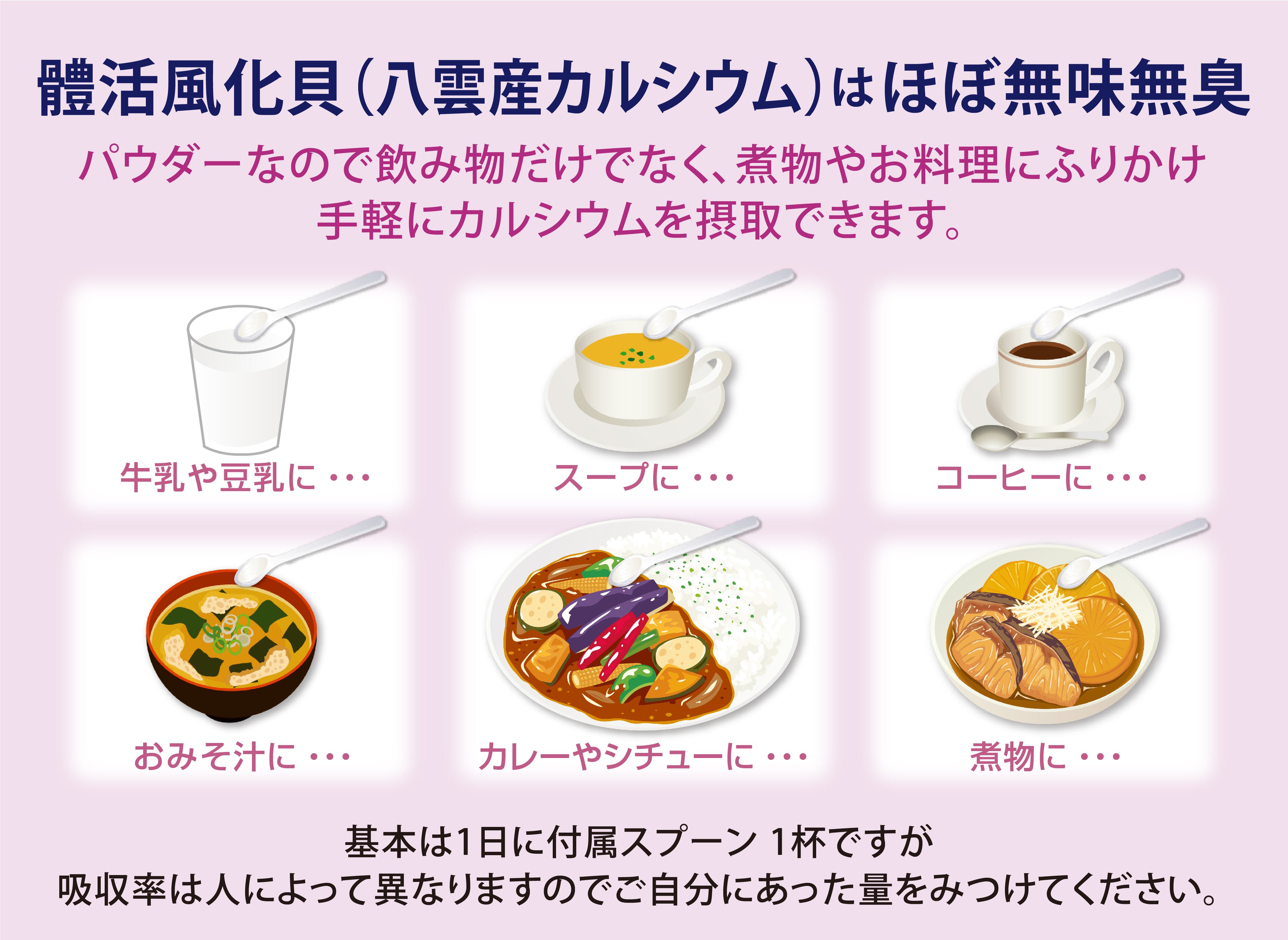 1500万~2000万年の時間をかけて自然の力で作られた貝のカルシウムは、身体が求める栄養をしっかりとサポートし、毎日の健康維持に役立ちます。そのまま飲むことはもちろん、スムージーや料理に加えることで、手軽にカルシウムを摂取することができます。